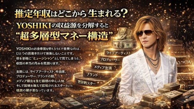 年収の正確な数字は公表されていないとしても、収益源の幅を分解していけば、なぜYOSHIKIが長年にわたって圧倒的な存在感を保てるのかはかなり見えてきます。